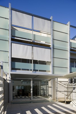 Ajustado a un Plan Especial anterior, se proyectó este conjunto residencial. Las viviendas adosadas se distribuyen en diferentes parcelas servidas por pequeños viales y asentadas en un terreno con una topografía descendiente en dos direcciones. Este relieve del suelo produce en los adosados un automático y débil escalonado de su perfil superior, de difícil control arquitectónico. Para resolverlo se ha creado en este volumen otro escalonado más importante subrayado por las fachadas, partidas en la composición por sus cerramientos, terrazas y placas solares.